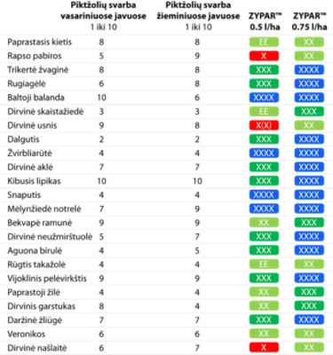 Zypar padės sėkmingai sunaikinti visas ž.ir v.kviečių, ž.ir v.miežių, kvietrugių ir rugių plačialapes piktžoles, kurios daugiausiai kelia susirūpinimo ir įtakoja derliaus kiekybę.